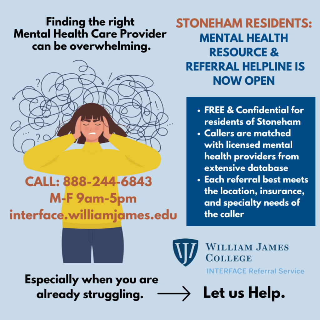 The Interface Referral Service Helpline is available to Stoneham residents and public school students. The helpline is open Monday-Friday 9am-5pm at 888-244-6843 (toll free). To learn more about this program or to see other communities currently contracting with this service visit: interface.williamjames.edu/.