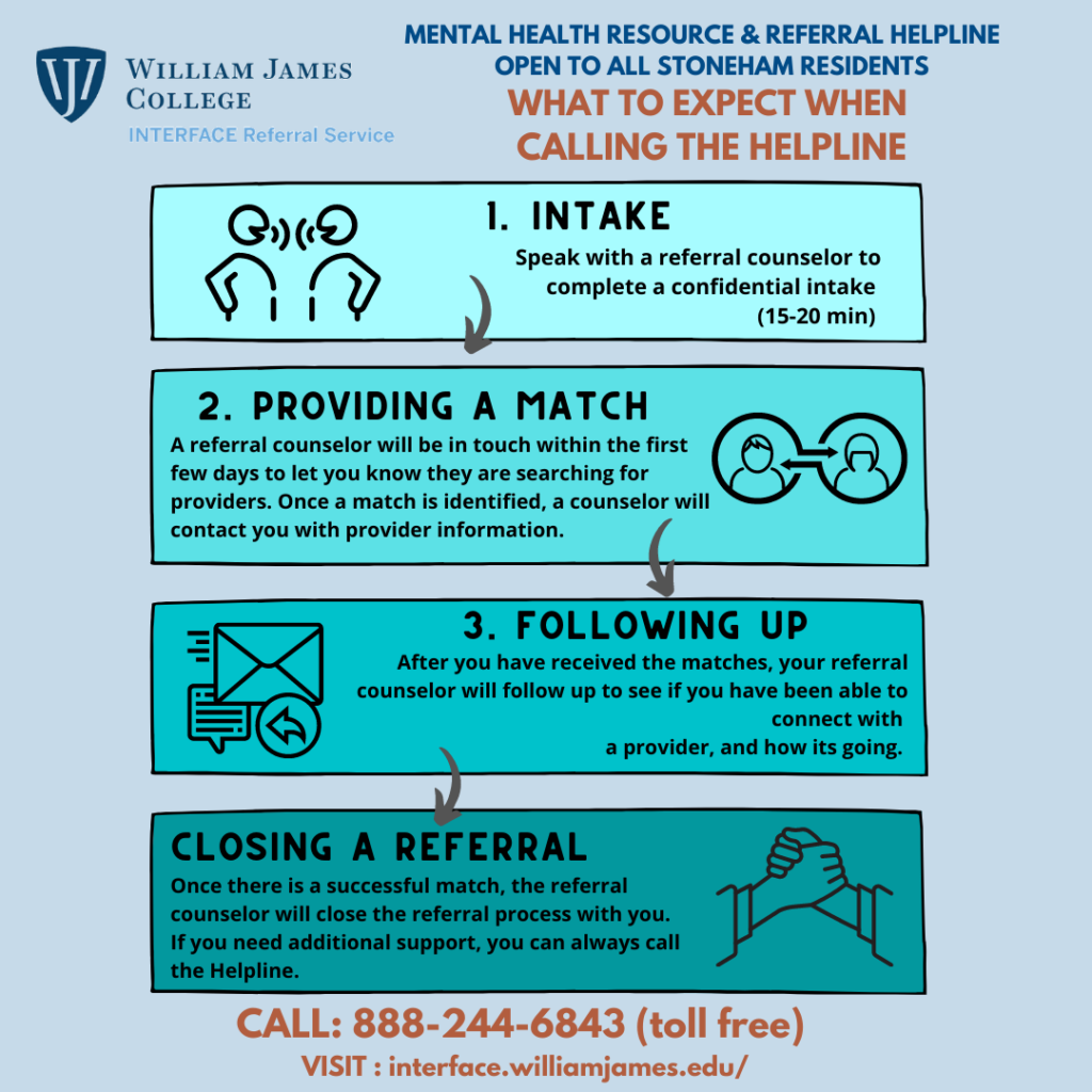 Stoneham residents can now call to receive personalized matched referrals to outpatient mental health providers (based on factors such as insurance, location, type of provider needed, and availability) through the INTERFACE Referral Service Helpline. The process begins with an intake call that takes 15-20 minutes. When someone calls, they will speak with a Resource and Referral Counselor and will be asked to complete a confidential intake. The caller will be asked for some basic contact information, information about the individual or their dependent, insurance information, availability to meet with someone, and general information about what the individual is concerned about. Each caller will receive a case number to keep the process confidential. Within several business days, the caller is assigned to a lead Resource and Referral Counselor who will begin a search for an outpatient mental health provider match by utilizing a tailored search process in their database, as well as other resources to find a match. The INTERFACE Referral Helpline is committed to making a match with a provider as soon as possible, usually within two to three weeks of receiving the intake. INTERFACE counselors follow up with callers after the match is received to ensure the provider is a good fit. There is no limit to how many times an individual or family can use this service.